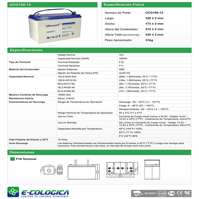 La Batería de Gel Ultracell UCG100-12 100Ah es una solución confiable y libre de mantenimiento para sistemas que requieren descargas profundas, estabilidad de tensión y larga vida útil.