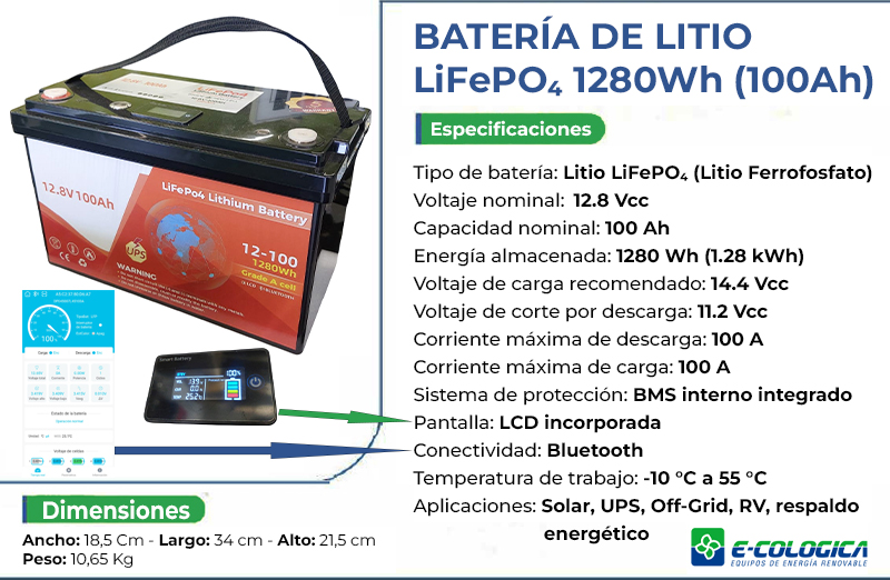 Ofrece 1280 Wh de energía útil, alta eficiencia, bajo peso y mayor vida útil frente a baterías tradicionales de plomo-ácido.