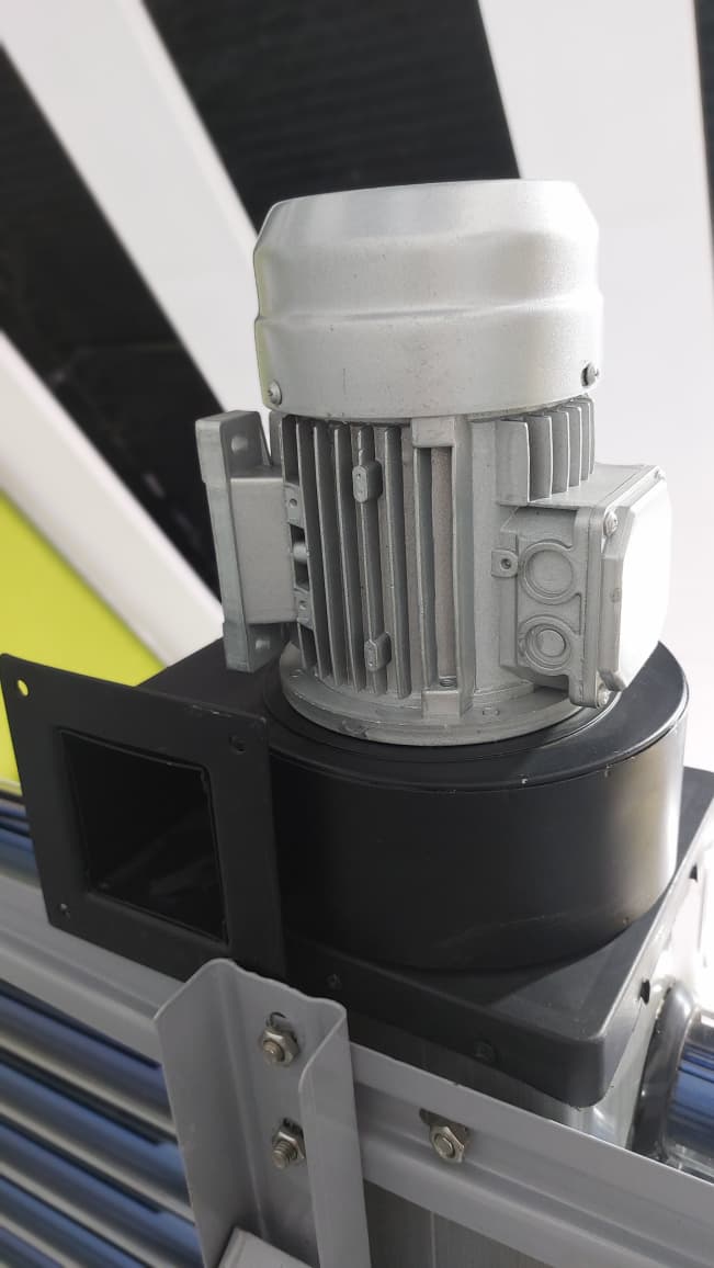 El soplador de aire especial de 90 W desplaza 200m3/hora de aire frio que al atravesar el colector lo vuelca en el ambiente a calefaccionar.