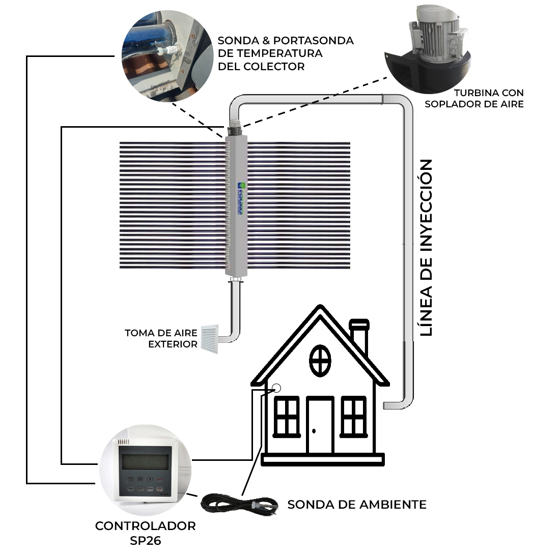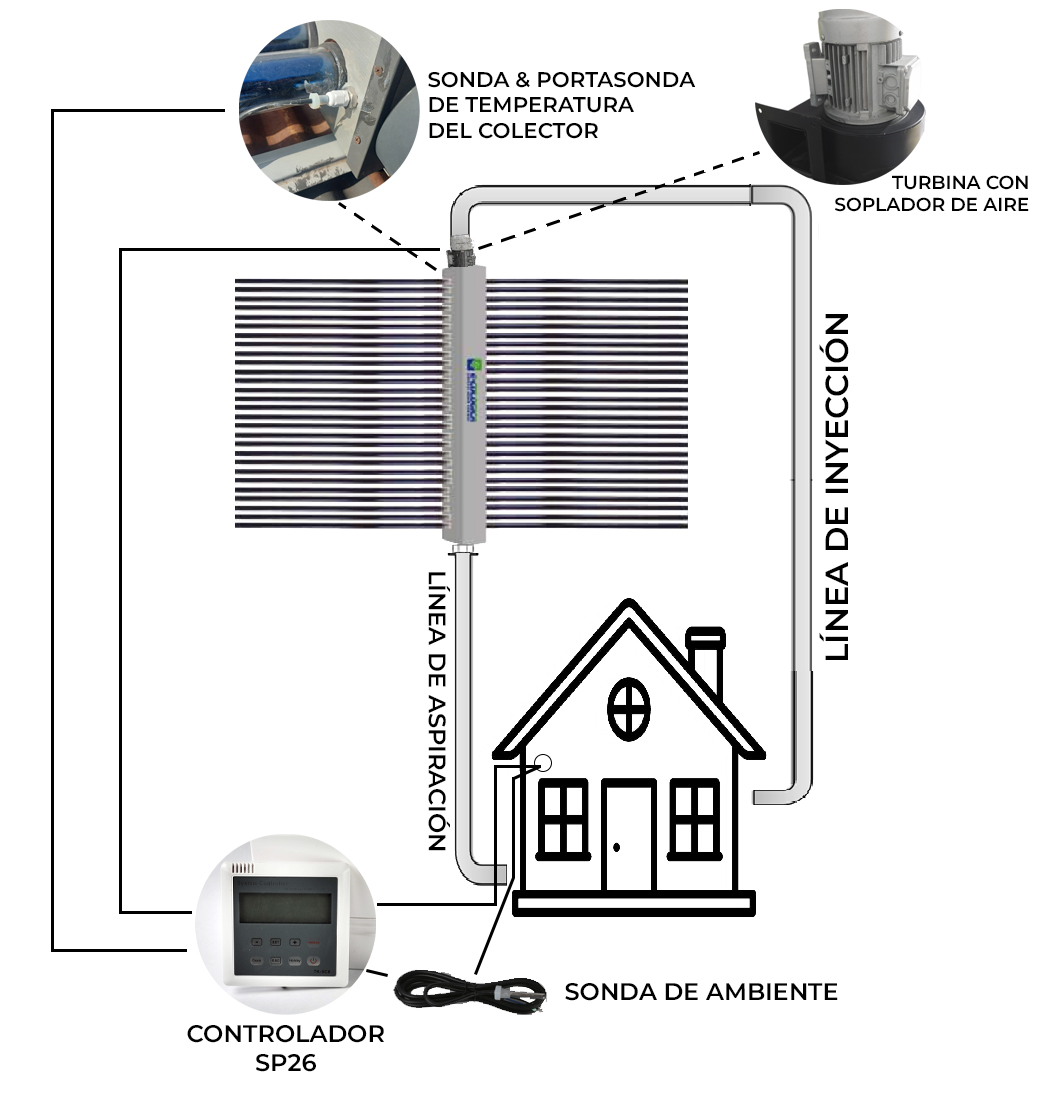 - Un controlador electronico diferencial con 2 sondas y porta sondas que compara continuamente la temperatura del aire en el colector y la del ambiente, activando la turbina si la temperatura del aire en el colector es mayor a la que hay en el ambiente y desconectandola si la temperatura en el colector es igual o menor a la del ambiente a calefaccionar.