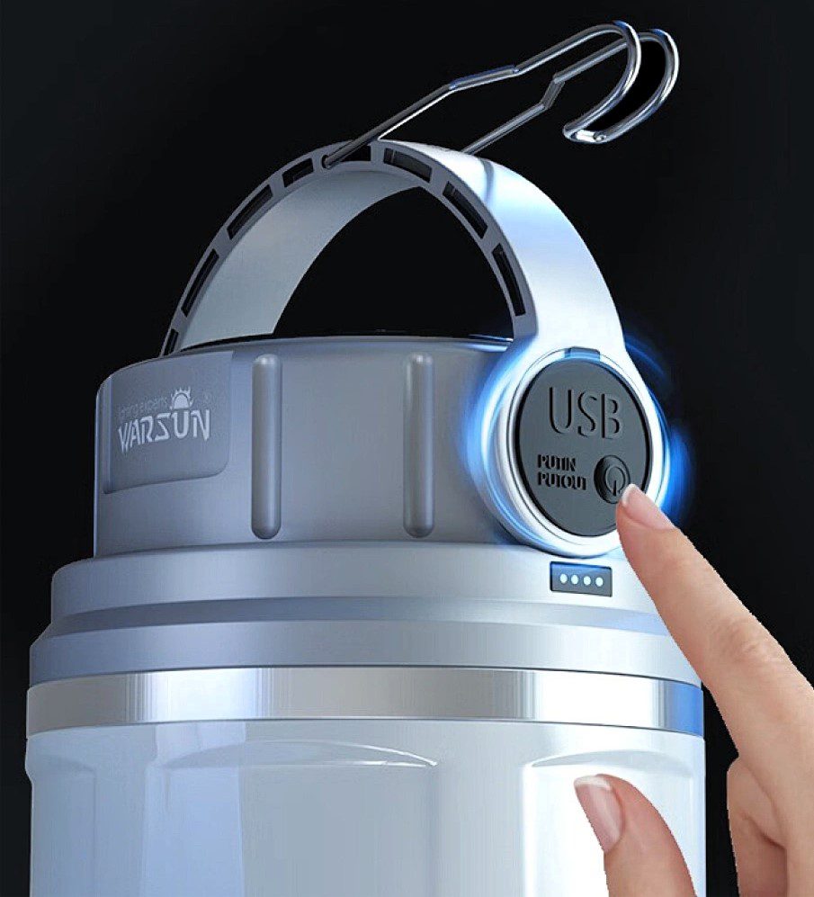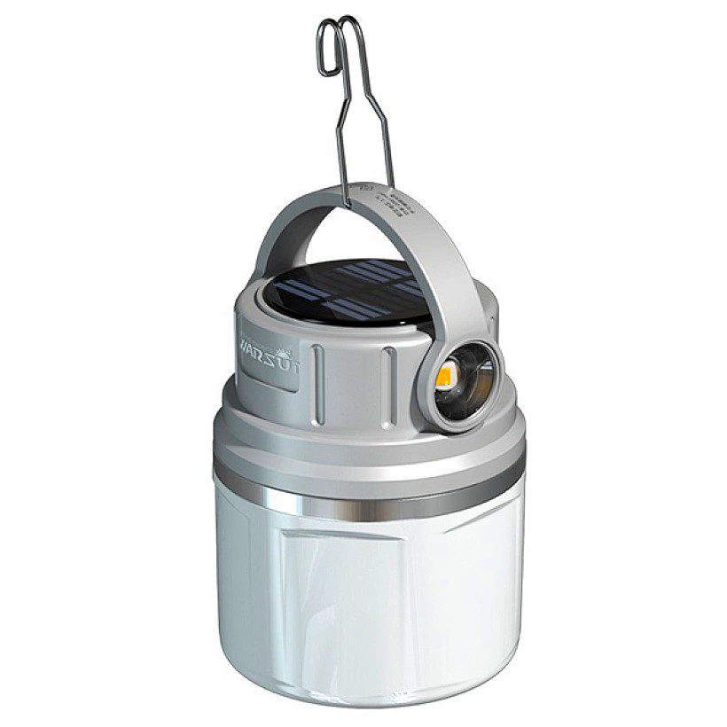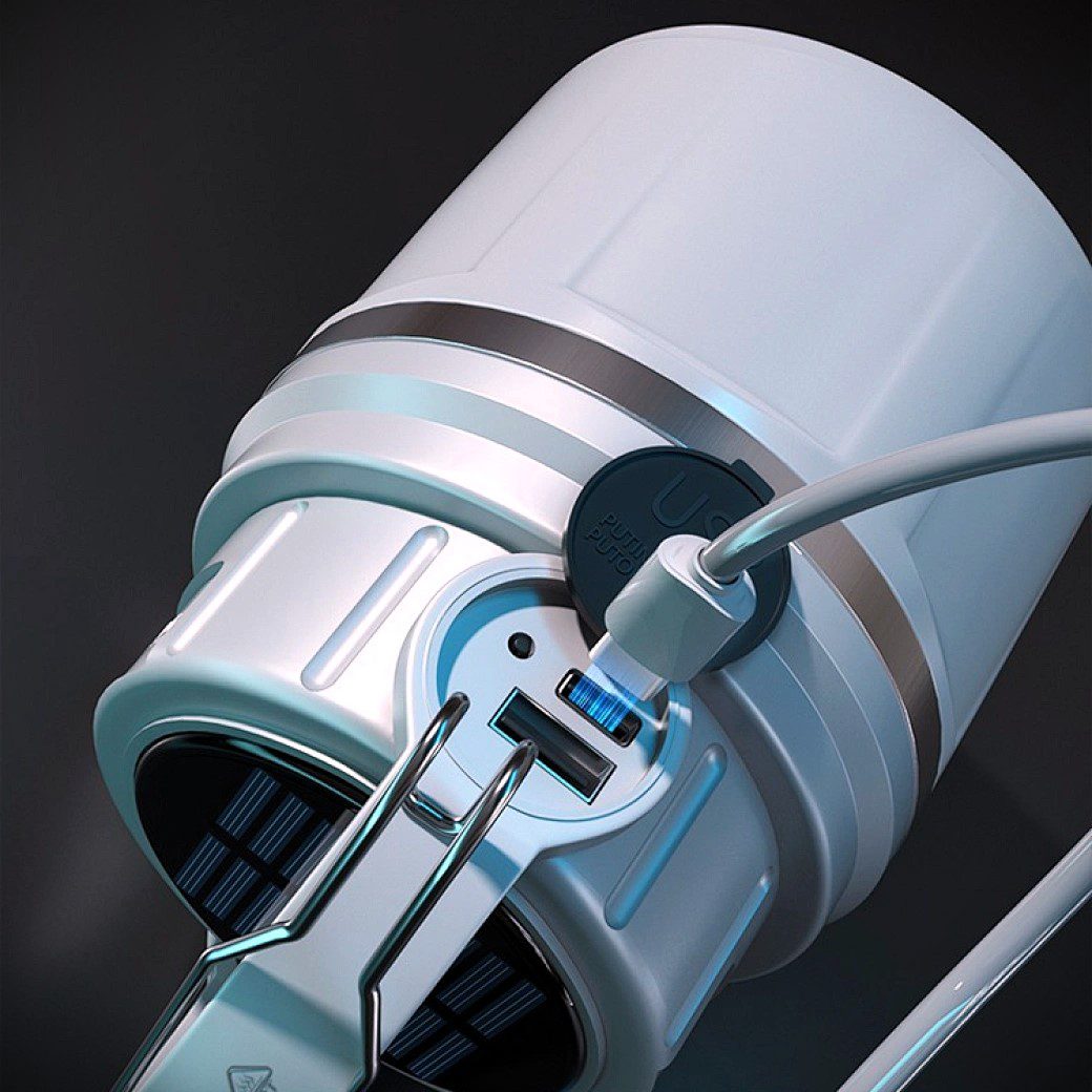 Lámpara solar portátil con tecnología LED/COB, batería dual (2x2000mAh) y panel solar incorporado. Ofrece 4 modos de iluminación (alto, medio, estroboscópico y linterna lateral). Flujo luminoso de hasta 800 lm, autonomía de 15 a 40 horas, carga por USB-C o panel solar. Incluye puerto USB-A, protección IPX5, gancho plegable e indicador de batería.