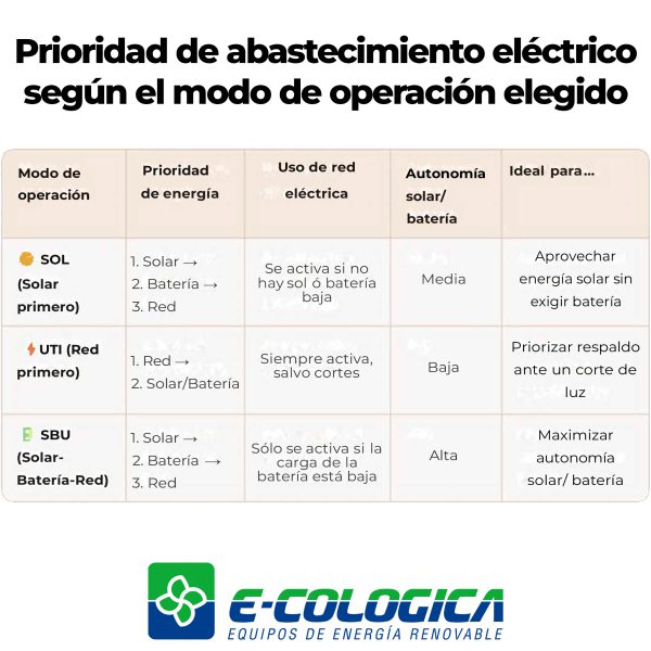 SBU (Solar- Batería-Red)Orden de uso: 1. Solar ⇒ 2. Batería ⇒ 3. Red | La red eléctrica solo se activa cuando se agota la carga disponible de la batería | Ideal para maximizar autonomía solar/batería Autonomía solar/batería: Alta |