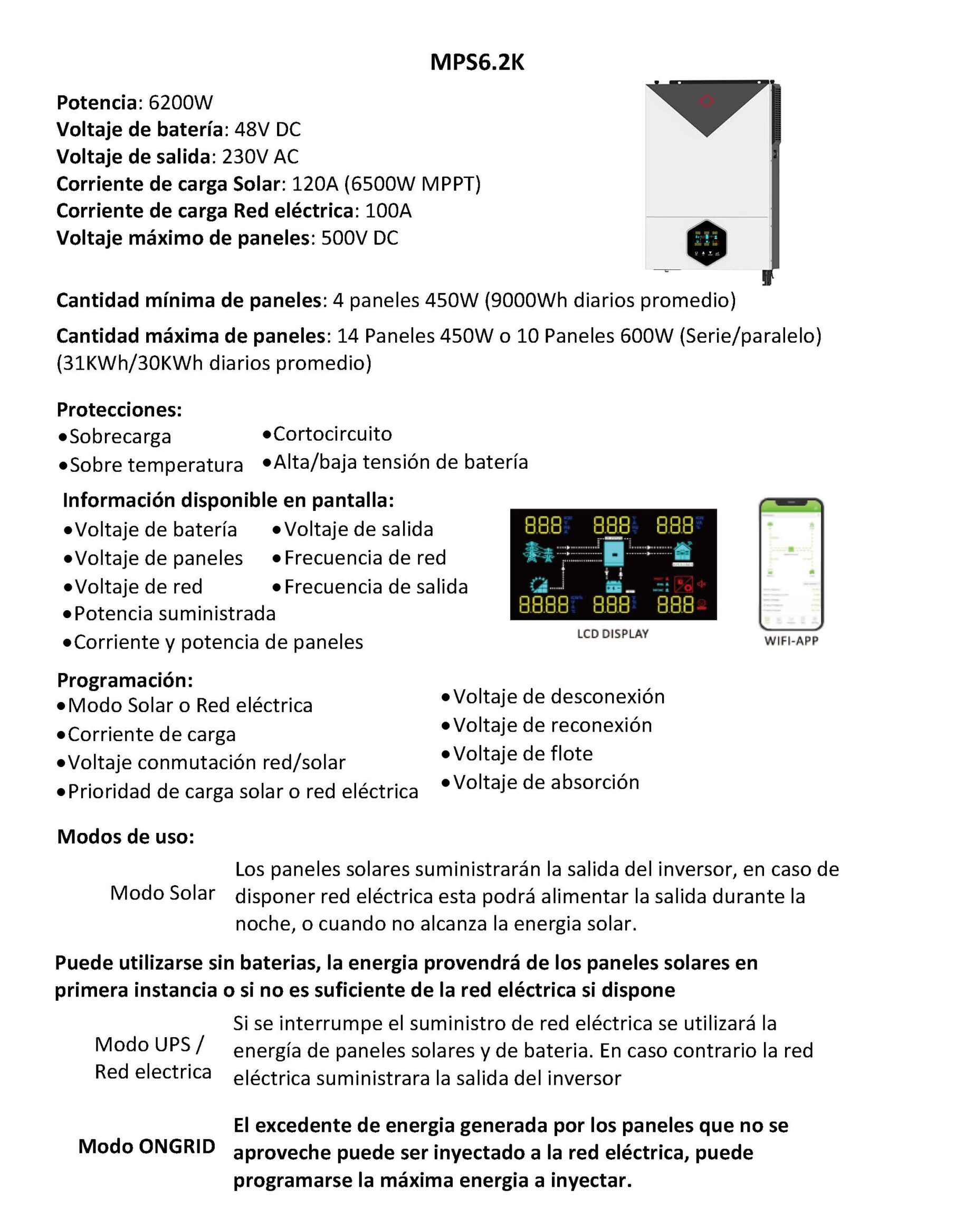 Inversor/Cargador 6,2KVA-6200W 120A MPPT 48V Mod. MPS6,2K