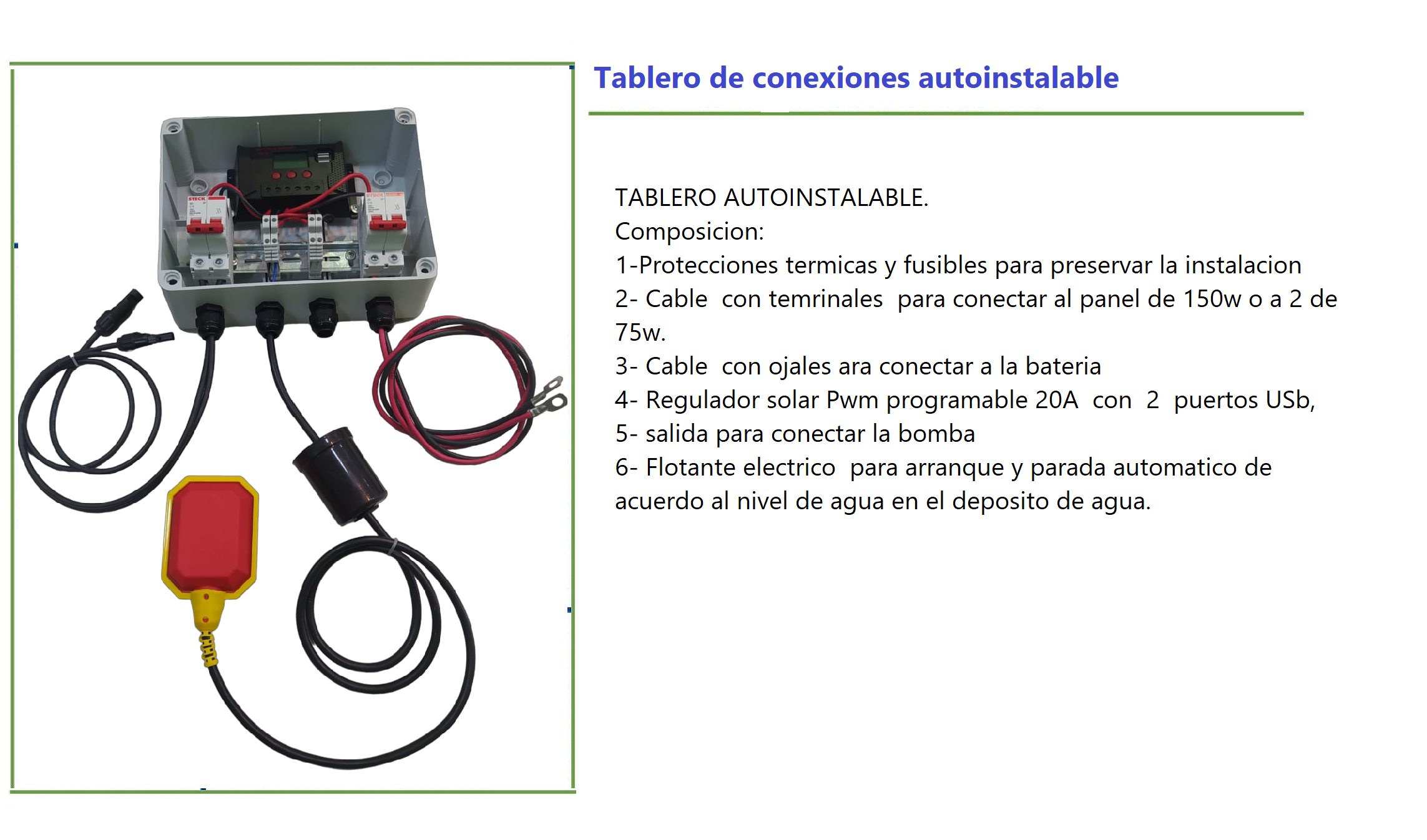 Este kit de bombeo compacto y eficiente está diseñado para uso domestico o aplicaciones rurales que requieren un bajo caudal diario. Adecuado para extraer agua de pozos, cisternas o tanques sin depender de la red eléctrica. Funciona completamente con energía solar, ofreciendo una alternativa sustentable y de bajo mantenimiento.