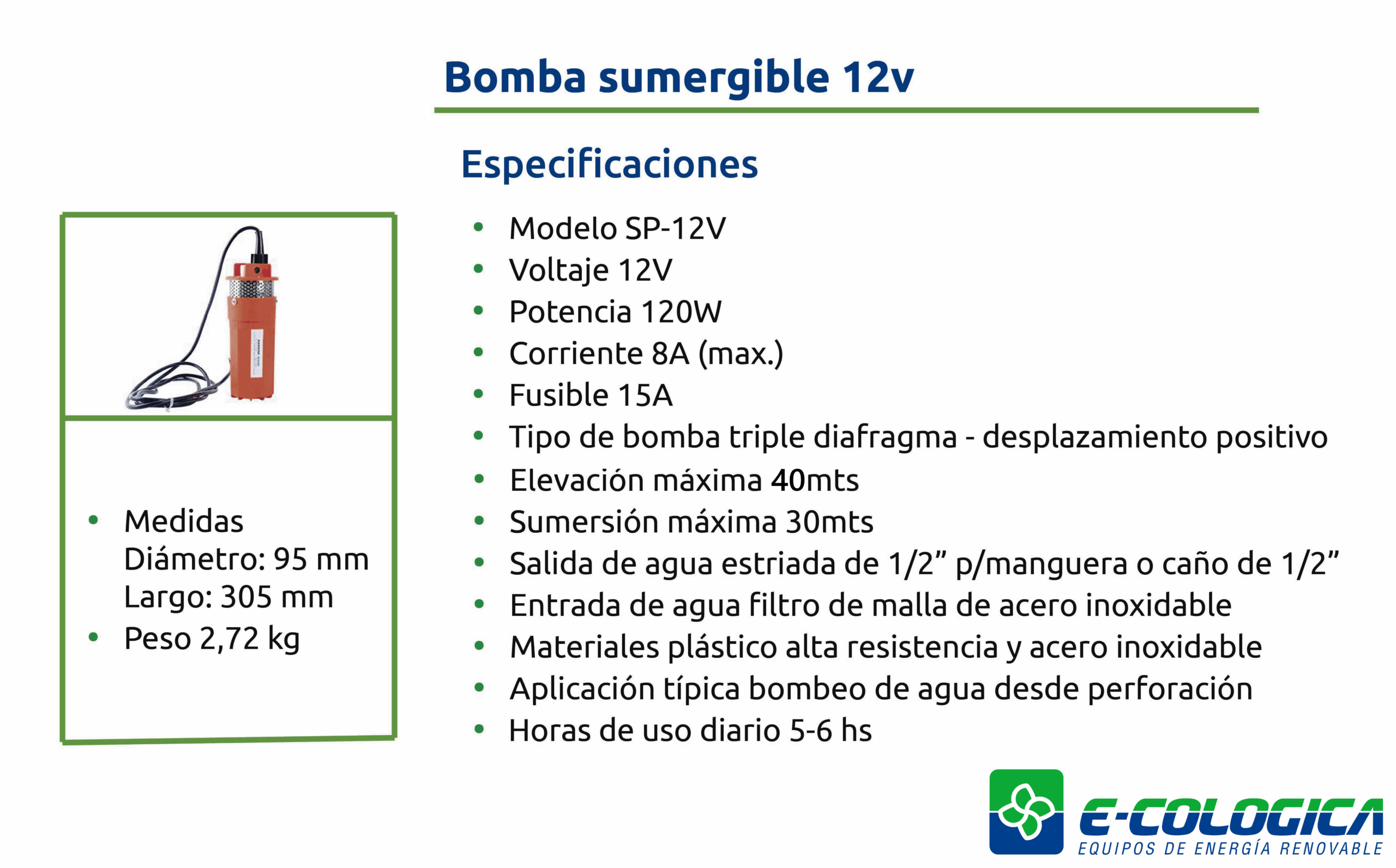 Bomba de diafragma 12 VDC ideal para pozos de 4″, con filtro de acero inoxidable y carcaza de polietileno reforzado, caudal de hasta 8 L/min., ofrece una elevación máxima de 30 m. Adecuada para uso solo en perforaciones o represas con aguas que tengan bajo porcentaje de solidos disueltos y en pozos con nivel estable de la napa de agua – no soporta uso en vacío-.