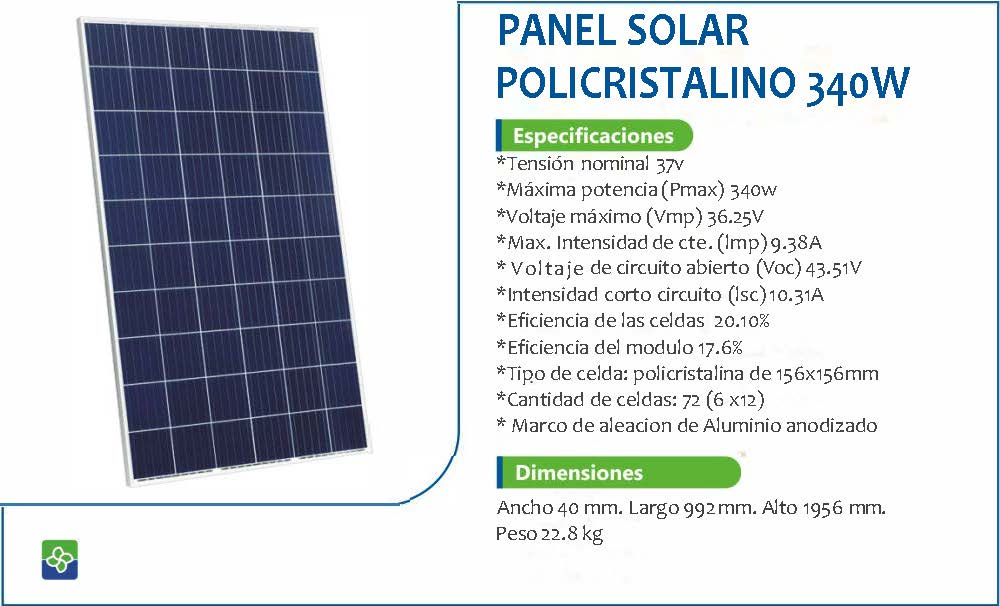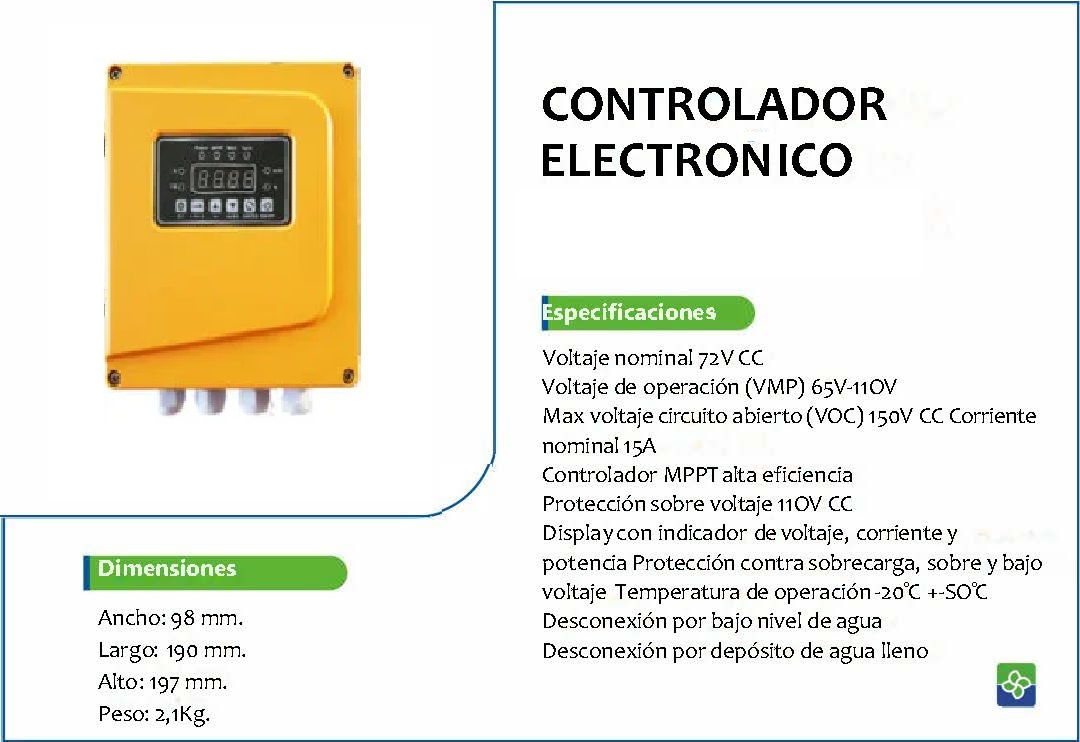El kit incluye: • 🔋 Panel solar policristalino de 340W Captura óptima de energía solar para alimentar el sistema incluso en días nublados. • ⚙️ Controlador electrónico inteligente Regula el funcionamiento del sistema, protegiendo la bomba y optimizando el rendimiento. • 💧 Bomba solar sumergible de 0.3HP • Caudal máximo: 40 litros/minuto • Altura máxima: 30 metros • Salida: ¾” Ideal para extracción de agua en profundidad con bajo consumo energético. • 📡 Sensor de nivel de pozo Evita el funcionamiento en seco, protegiendo la bomba y prolongando su vida útil. • 🛑 Flotante eléctrico para depósito Control automático del llenado, evitando derrames y sobrecargas. • 🧱 Juego de soportes para panel solar Estructura resistente y fácil de montar, adaptable a distintas superficies.