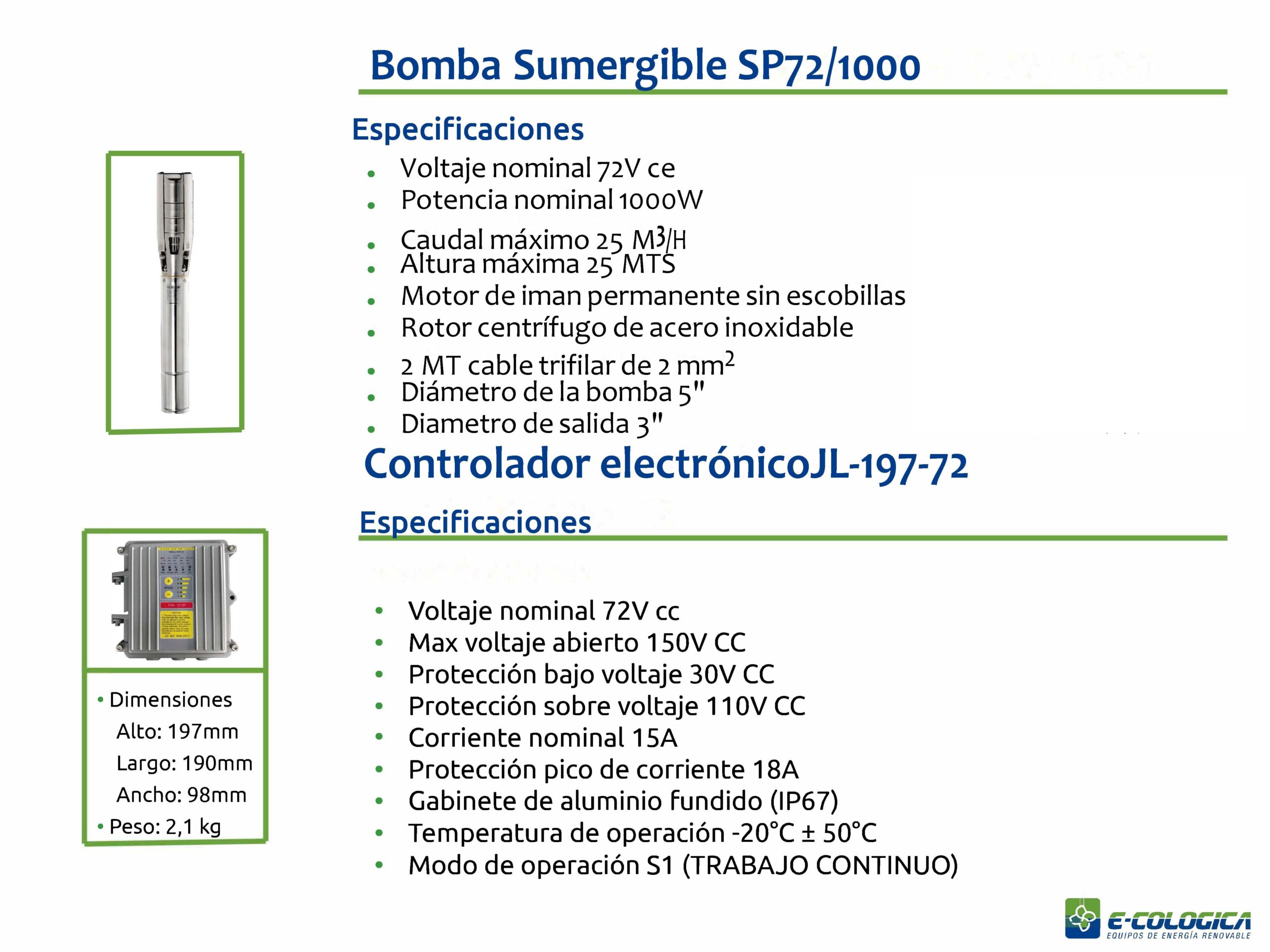 Equipada con motor sin escobillas y rotor centrífugo de acero inoxidable, garantiza eficiencia y durabilidad. Incluye controlador electrónico JL-197-72 con protección contra sobrevoltaje, bajo voltaje y picos de corriente. Gabinete IP67 apto para intemperie.