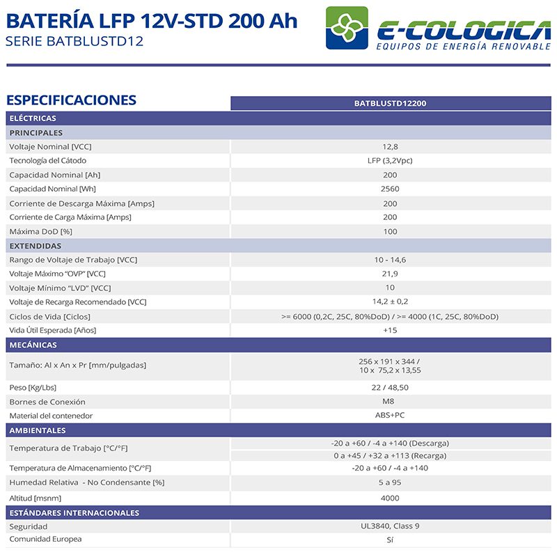La batería puede proporcionar una vida útil de +4000 ciclos en condiciones estándares de trabajo.