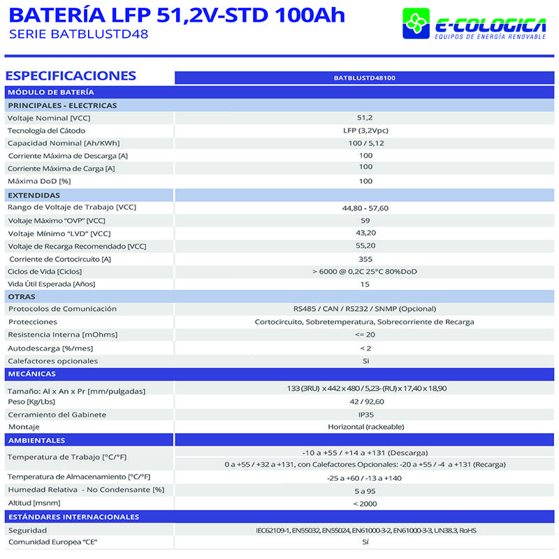 Batería de 100Ah de capacidad 51.2V, ideal para aplicaciones solares que trabajan en 48V.