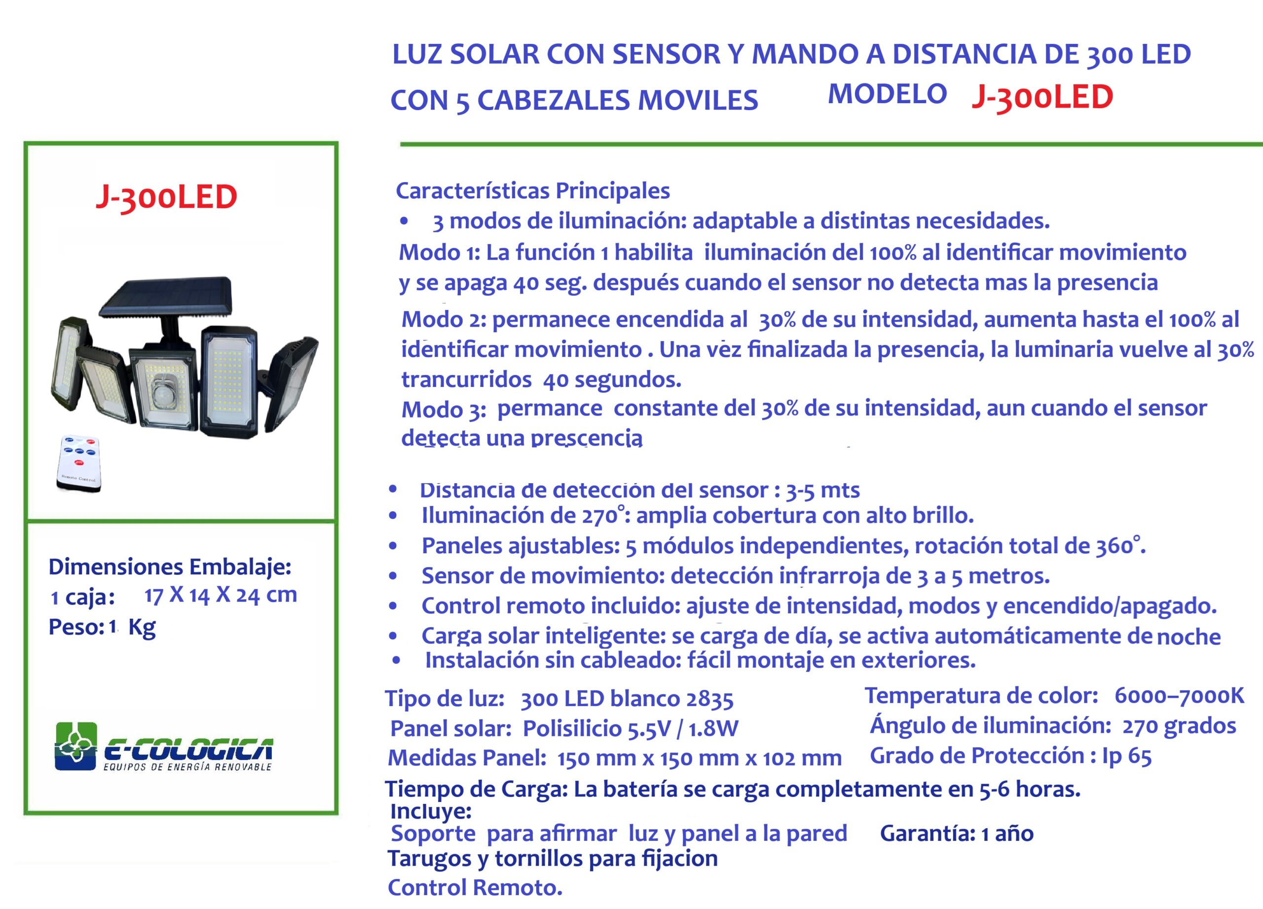 Ilumina tu hogar con energÃa renovable. Esta lámpara solar de 300 LED y 5 cabezales móviles ofrece 💡 3 modos de iluminación inteligente, 👀 sensor de movimiento de 3–5 m, y 📡 control remoto para mayor comodidad.