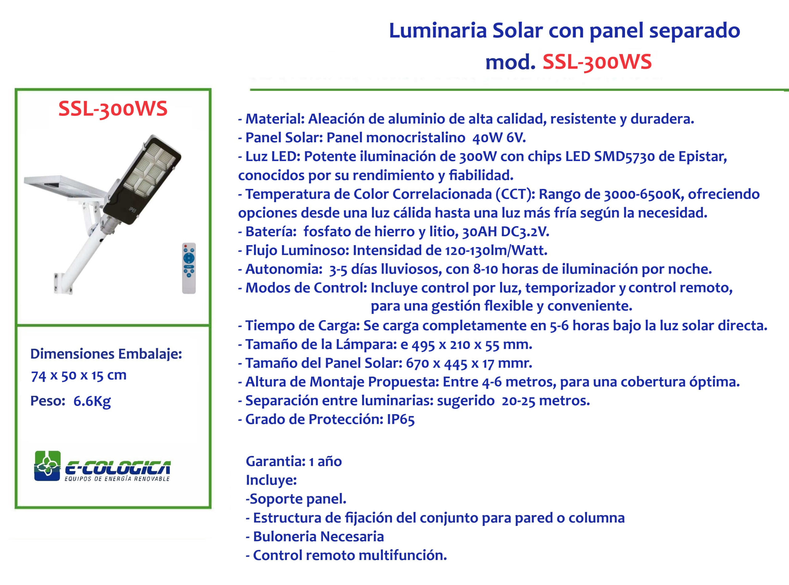 Luminaria Solar LED para alumbrado público de 300W con Panel Separado de 40W 6V, Batería de Litio 30A, Control Remoto & Soporte para fijación sobre columna ó pared. Ilumina hasta 120 m² con autonomía de 8 a 10 horas. Resistente al agua (IP65), incluye soporte, estructura de fijación y control remoto multifunción. Ideal para montaje en pared o columna, con instalación sugerida entre 5 y 6 metros.