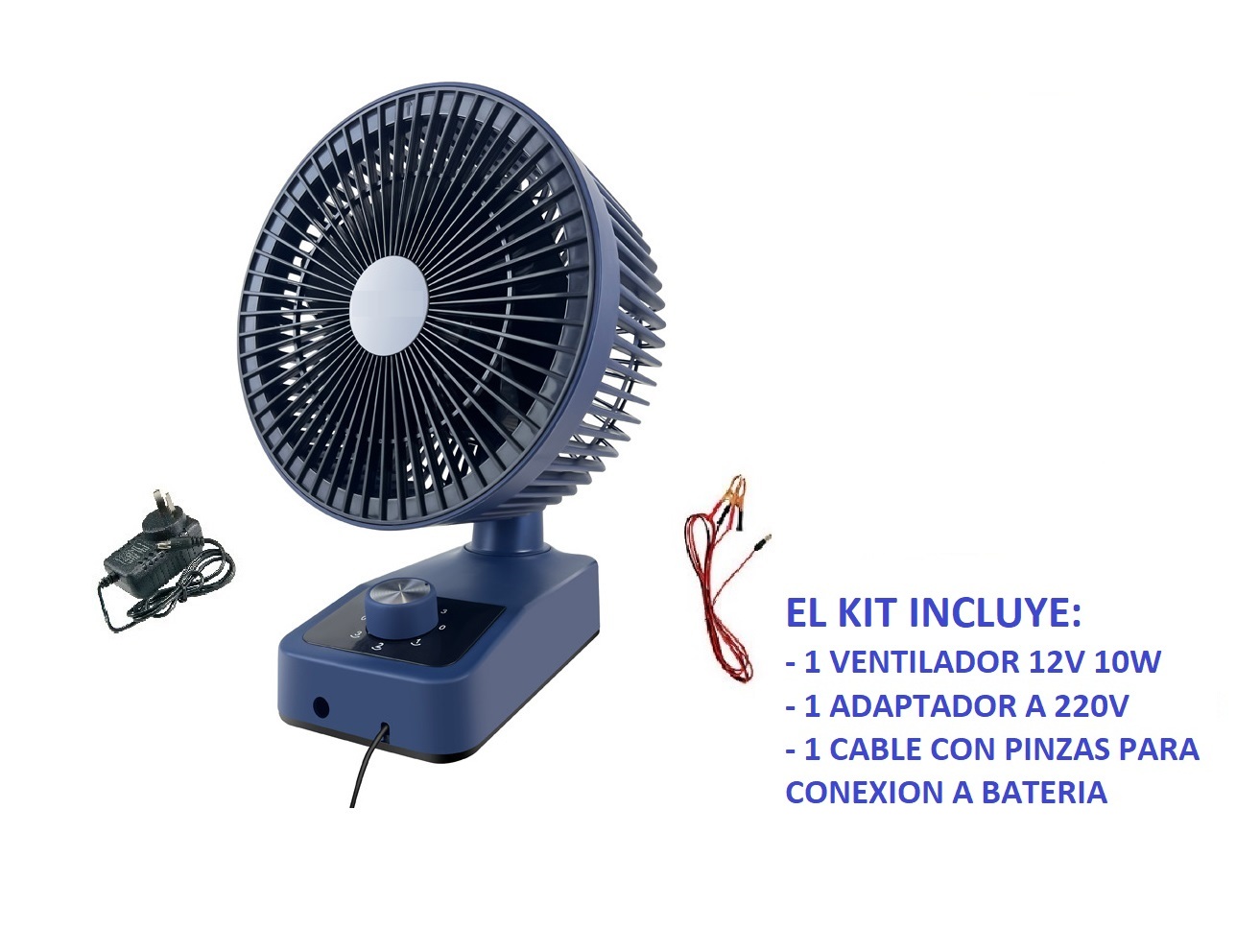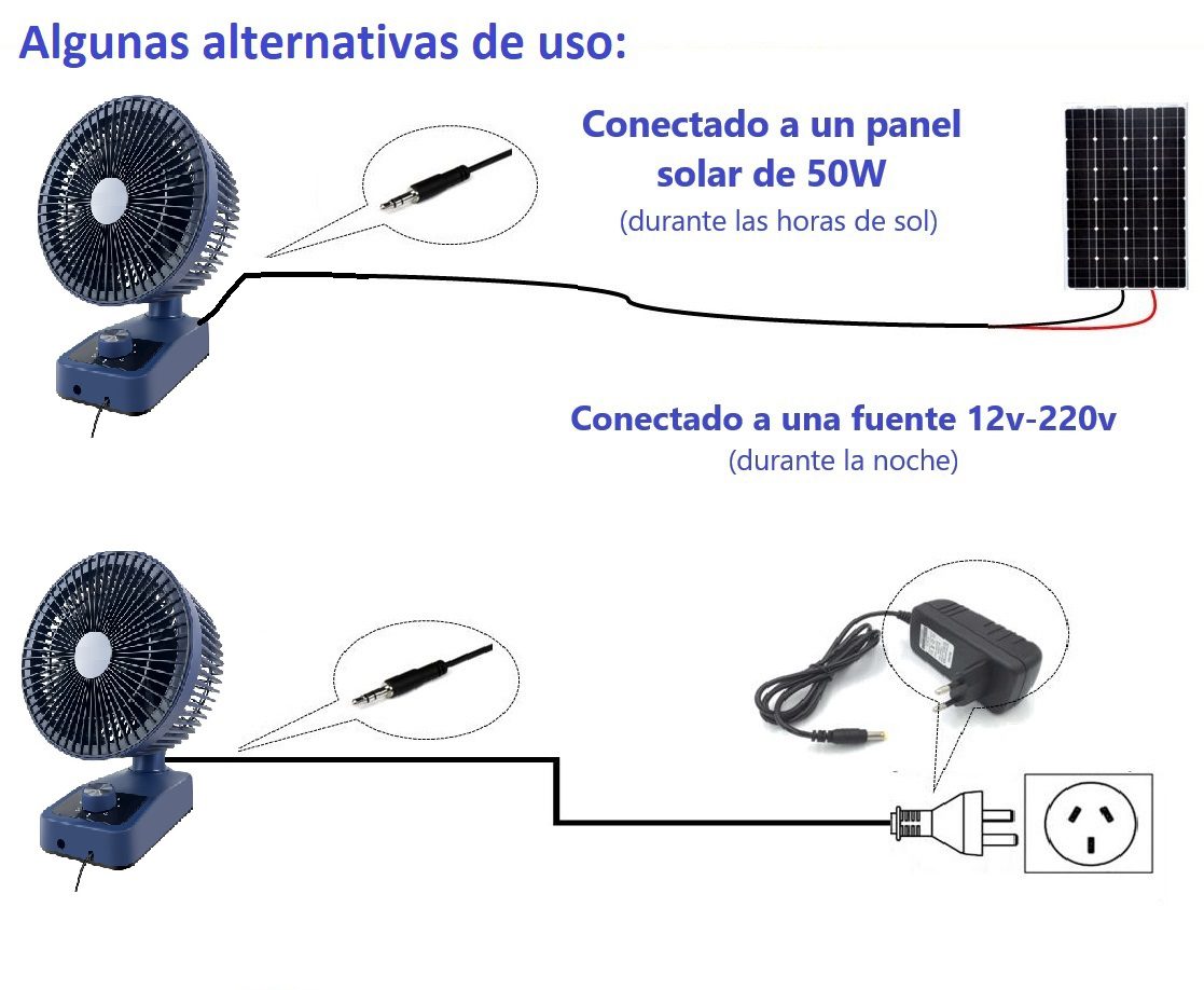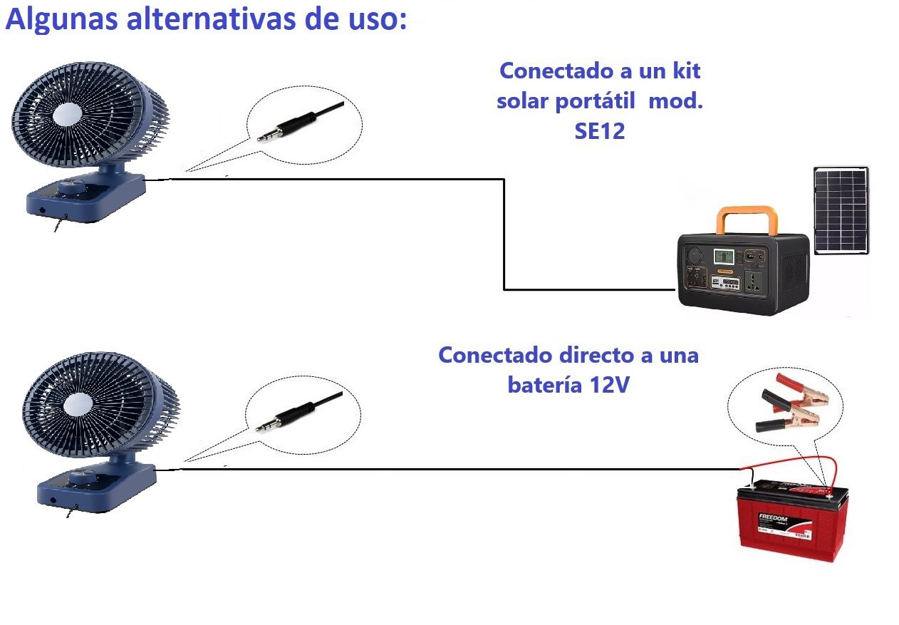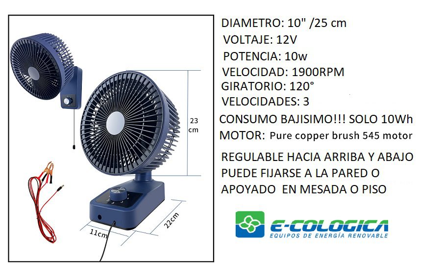 Ventilador de mesa o pared 12V 10W con 5 aspas y 3 velocidades. Diámetro de 10″ (25 cm) , giro de 90° y temporizador de hasta 1 hora. Bajo consumo (10Wh). Ideal espacios reducidos y para utilizar en sistemas solares de 12v ( cabañas, motorhome, etc).